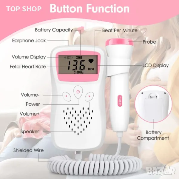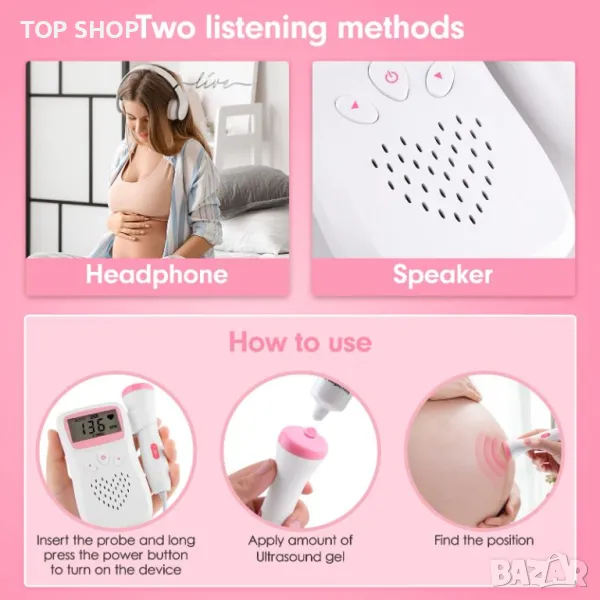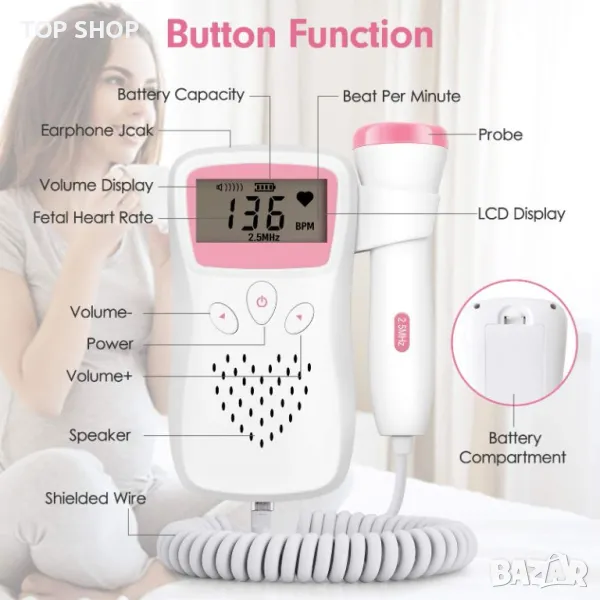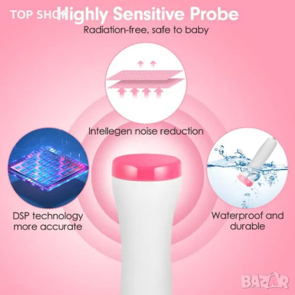 Водоустойчива сонда с висока чувствителност, 12~16 седмици може лесно да чуе сърдечния ритъм на плода. Използвайки ясни чипове за настройка, звукът е по-реалистичен.