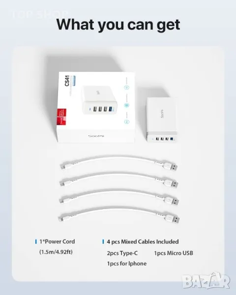 Какво получавате в кутията: 1 бр. SooPii 4-портова зарядна станция, 1 бр. 5 фута AC захранващ кабел, 4 пакета 1,6 фута смесени кабели за зареждане (2 бр. Тип C, 1 бр. за lPhone и lPad, 1 бр. Micro) за ежедневна употреба, Ръководство за потребителя, нашето безгрижно 24-месечно и приятелско обслужване на клиенти.