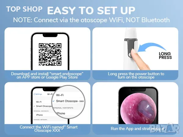 SMART Отоскоп ScopeAround 3,9 мм ултратънък безжичен цифров отоскоп WiFi ушен отоскоп със светлина