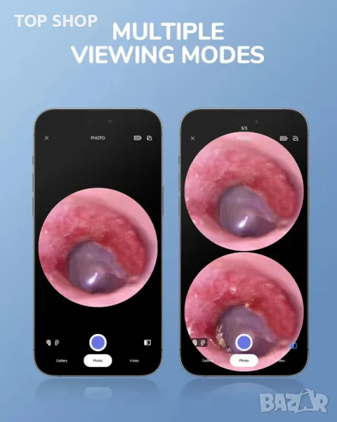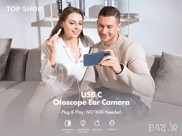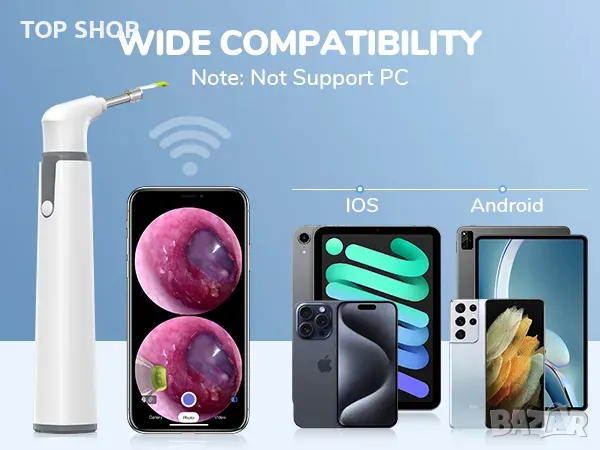 Тази камера за премахване на ушна кал е подходяща за устройства с iOS и Android (смартфони и таблети) и поддържа зареждане през USB порт. ЗАБЕЛЕЖКА: Този продукт НЕ поддържа компютри PC и Mac.