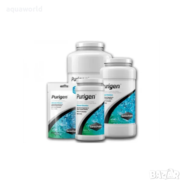 SeaChem Purigen® е първокласен синтетичен адсорбент, който не прилича на никой друг филтриращ продукт. Той не е смес от йонообменни съединения или адсорбенти, а представлява уникален макропорест, синтетичен полимер, който премахва разтворимите и неразтворимите примеси от водата с дебит, който надминава всички други предлагани продукти на пазара с повече от 500%. Продуктът контролира концентрацията на амоняк, нитрити и нитрати, чрез премахване на азотсъдържащи органични отпадъци, които иначе биха се освободили при различните биологични процеси. Въздействието на модела върху микроелементите е минимално. Това значително повишава редукцията. Той избистря аквариумната вода до несравнима яснота. При приложение Purigen® променя първоначалния си цвят, като постепенно потъмнява, което намалява неговото действие и е лесно да се регенерира чрез третиране с белина. Предназначен е, както за морски, така и за сладководни аквариуми. Инструкции : изплакнете преди употреба. Използвайте фина мрежеста торбичка. Всеки един литър третира до 4000 литра, в продължение до шест месеца. Изчерпването на капацитета на продукта се съпровожда с ясно изразена промяна в цвета на зърната до тъмнокафяв или черен. Регенерация : накиснете продукта в съотношение 1:1 белина : воден разтвор за 24 часа в неметален съд и в добре проветриво място, далеч от деца. Използвайте 8,25% - ен разтвор на белина (без аромат и оцветители). При изваждането изплакнете добре, след това накиснете за 8 ч в разтвор, съдържащ 4 супени лъжици Prime® на чаша вода. Пак изплакнете. За използване в сладководни аквариуми, киснете препарата в продължение на 4 часа в разтвор, съдържащ 2 супени лъжици буфер на чаша вода (напр.