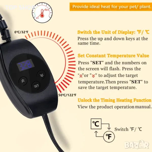 ТЕМПЕРАТУРА - Лесен за работа с термостата, само с 3 бутона можете лесно да настроите температурата или да превключвате дисплея между Фаренхайт / Целзий за секунди. Максималната температура на нагряване може да достигне 50°C (122°F). Нагревателната подложка FIPASEN под резервоара осигурява на вашия домашен любимец или растение нежна, постоянна топлина за 24 часа и следи и контролира температурата през цялото време.