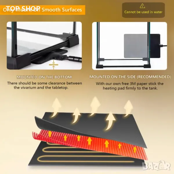 терариум FIPASEN може да се монтира на дъното или отстрани на вашата детска стая. Обикновено предлагаме на клиентите да го инсталират отстрани на резервоара. Никога не монтирайте нагревателната подложка за влечуги така, че да капсулира топлината. Препоръчва се да се използва с резервоар от стъклен материал и да се държи далеч от запалими материали.