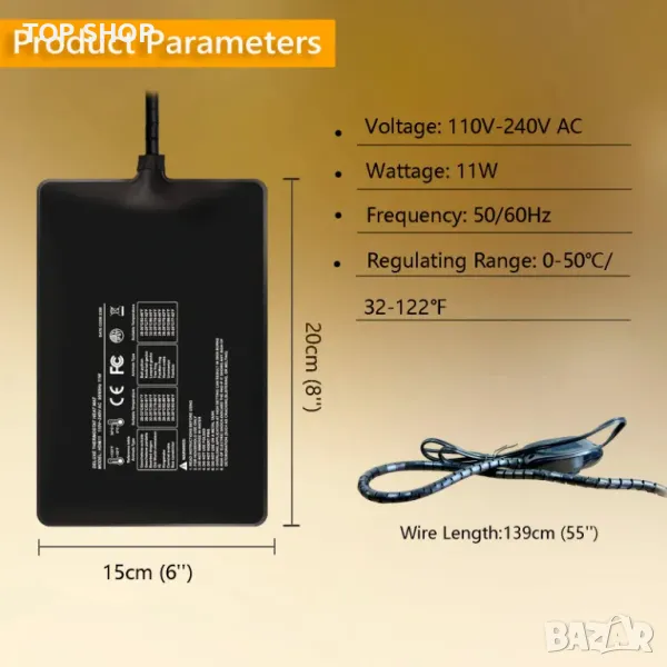 СИЛНО ЛЕПИЛО И МНОГО РАЗМЕРИ ОПЦИИ - ЕС напрежение 110-240V и стандартен щепсел, не е необходим адаптер. Размерът от 15x20cm е идеален за терариум от 20-30 галона, а размерът от 20x30cm е идеален за терариум от 30-40 галона. Моля, оставете нагревателната подложка да се загрее известно време, преди да използвате самозалепваща се хартия 3M, нагревателната подложка ще стане по-плоска, така че контактната хартия на 3M да може да се залепи по-добре.