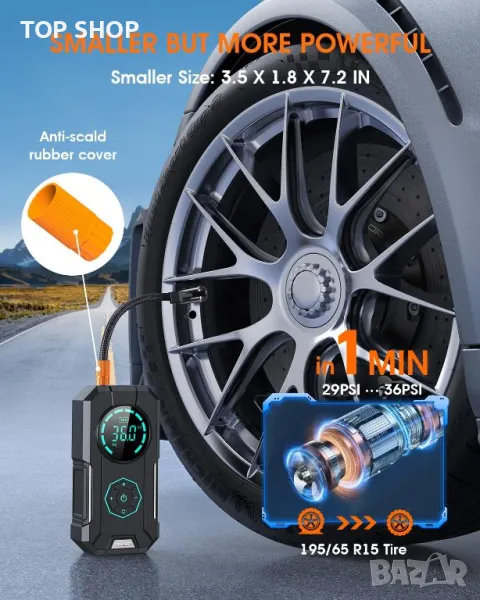 ПО-МАЛЪК, НО МОЩЕН: По-малка преносима помпа за гуми е оборудвана с 22-цилиндров двигател, гуми 195/65R15 могат да бъдат напомпани от 30 PSI до 36 PSI за 1 минута и от 0 PSI до 36 PSI за 5 минути. МОЛЯ, ОБЪРНЕТЕ ВНИМАНИЕ: Моля, монтирайте оранжевия гумен маншет против изгаряне на връзката на надуваемата тръба, за да избегнете изгаряния при висока температура.