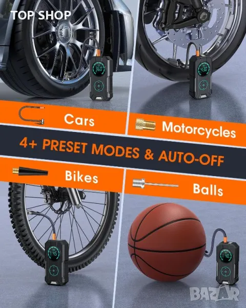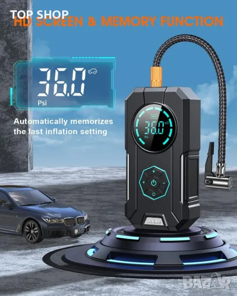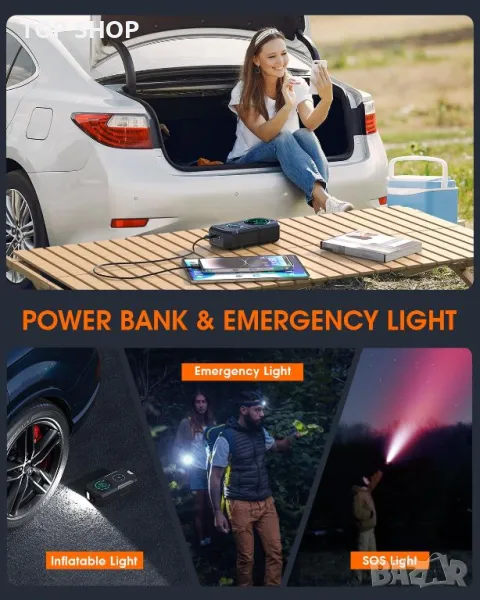 МНОГОФУНКЦИОНАЛНА ПОМПА ЗА ГУМИ: Електронната въздушна помпа с автоматично изключване надува различни устройства (коли, велосипеди, мотоциклети и топки). Това е също захранваща банка за телефон, аварийно фенерче и SOS лампа. Може да се справи с всякакви ситуации, когато пътувате.