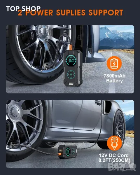 2 ПОДКРЕПИ ЗА ЗАХРАНВАНЕ: Вградената акумулаторна батерия от 7800 mAh на този въздушен компресор може да поддържа многократно надуване без кабел, а включеният захранващ кабел от 8,2 фута може да бъде свързан към 12V DC захранване на автомобила. Можете да надувате по всяко време и навсякъде, без да се притеснявате, че ще останете без енергия.