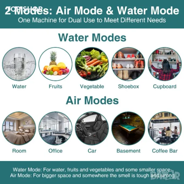 Проектиран както за вода, така и за въздух с 28000 mg/h (режим Air) + 500 mg/h (режим Water). Не само за по-голямо, но и за по-малко пространство. Всички озонови машини са само за НЕЗАЕТО пространство. Отворете вратата и прозореца за вентилация най-малко 30 минути, след което хората и домашните любимци могат да влизат в стаята.