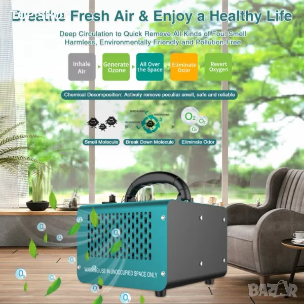 Вграден мощен турбо вентилатор за бързо засмукване на въздух и преобразуване на въздуха в озон, след което бързо издухва озона във въздуха. Прави озона бързо разпространен във всички пространства на помещението.