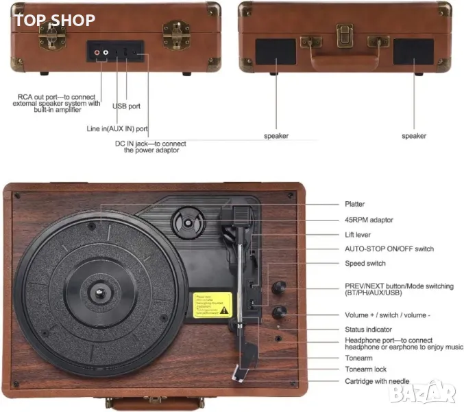 Стерео система: грамофонът има два вградени високоговорителя. За да балансираме резонансните и басовите ефекти, ние ограничаваме мощността до 5 вата и всяка мощност е подходяща за ежедневна употреба. Ако имате отлична аудио система, можете също да я свържете към този плейър чрез RCA или AUX порт и да се насладите на съраунд ефекта.