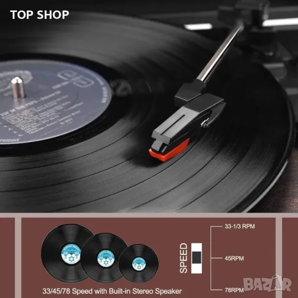 Грамофон с три скорости и три размера: Поддържа 7/10/12 инча 3-скоростно възпроизвеждане на винил и 3-скоростно възпроизвеждане при 33/45/78 об./мин. Нашият грамофон може да възпроизвежда записи точно и да ви осигури по-добро качество на звука.