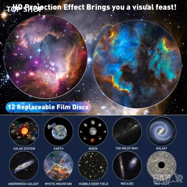 Този планетариумен звезден проектор се доставя с 12 филмови диска с планети и естествена светлина. HD галактическите светлини ще изпълнят стените и таваните със звезди и мъглявини, създавайки потапящо изживяване, сякаш сте в галактика. Можете да използвате нощни светлини в спалнята си, за да създадете мистична нощ, изпълнена със звезди мъглявина планетариум космическа зона.