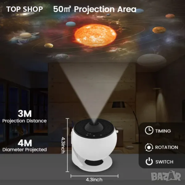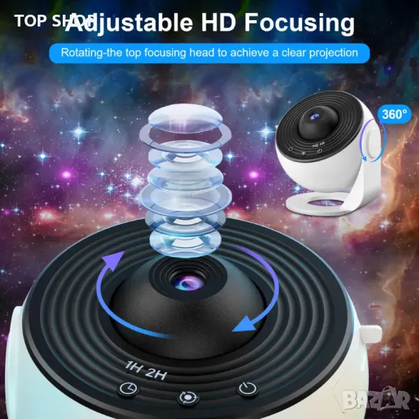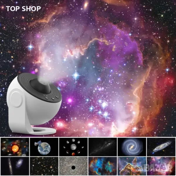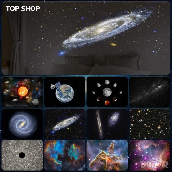 Този галактически проектор за спалнята се предлага с 12 сценария за показване: Слънчева система, Земя, Луна, Млечен път, Галактика, Галактика Андромеда, NGC4302-NGC4298, Хъбъл Deep Field, M60--UCD1, Север Мъглявина Америка, Мистична планина и Малък магеланов облак, които могат да бъдат поставени във вашата всекидневна или спалня, за да добавите усещане за технология към вашия дом.