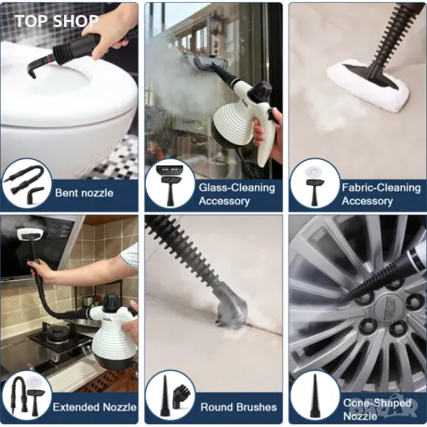 Уредите за пара GLOIL вършат страхотна работа при почистване и гладене. Плюс комплект аксесоари от 10 части като: ъглова дюза, огъващ се удължител, дюза с четка, инструмент за пара за плат, гумена чистачка за прозорец/врата и много други екстри. Той е универсален и може да отиде и да почисти всякакви труднодостъпни празнини, ъгли, ъгли, както и различни повърхности/материали: кухненска мивка, плот, тоалетна, барбекю скара, завеси за душ, под, детска играчка, матрак за домашни любимци, диван , кола и дрехи.