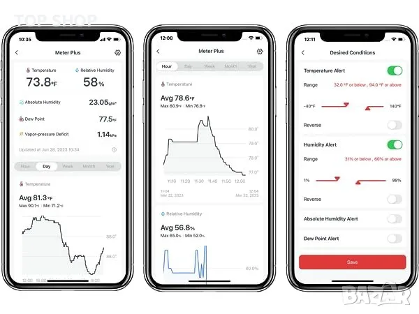 Hub), можете да преглеждате и експортирате данни за температура, влажност, абсолютна влажност, точка на оросяване и VPD чрез приложението.