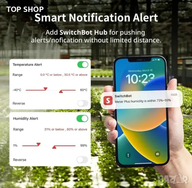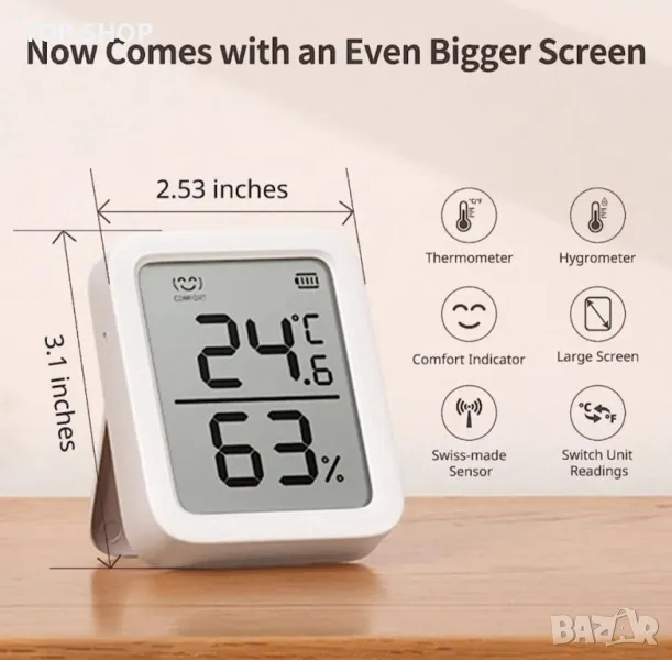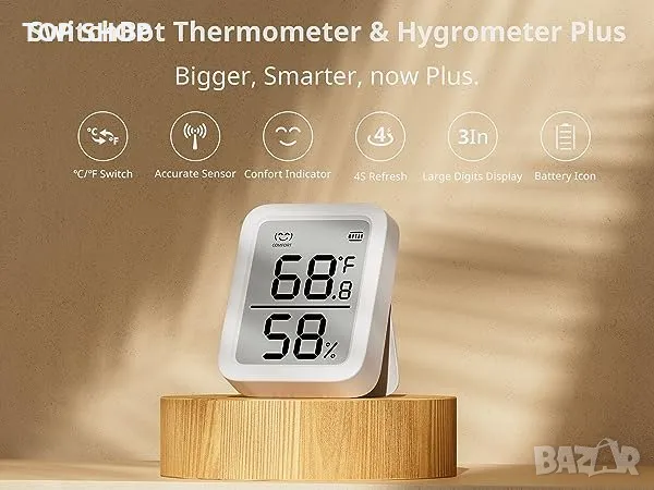 SwitchBot Thermometer Hygrometer Plus сега предлага още по-добър начин да сте в крак с температурата и влажността около вас. С 3-инчов голям дисплей, по-бързи скорости на опресняване на данните, интелигентни сигнали и интуитивни икони за показване на емотикони ще откриете, че управлението на температурата е още по-лесно от всякога.