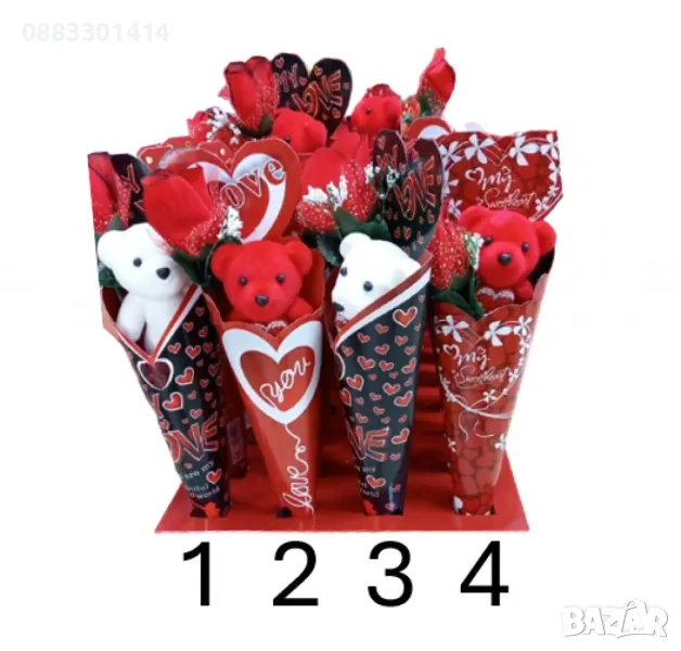 Вариант 4: Червено мече с червена роза – държи сърчице, в червена хартия с надпис "My sweetheart".