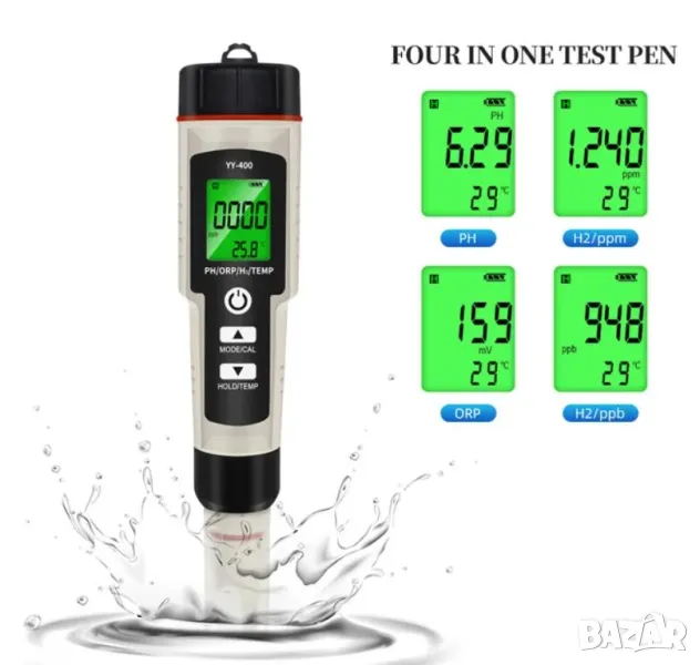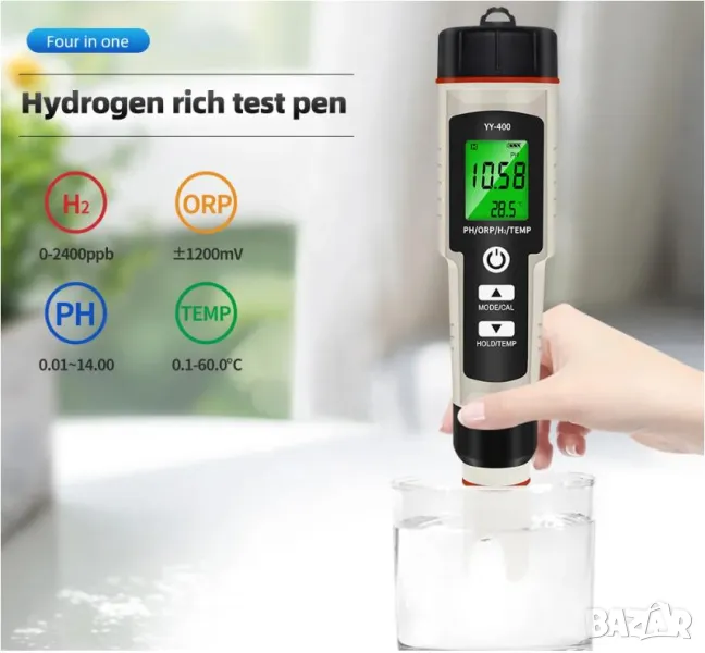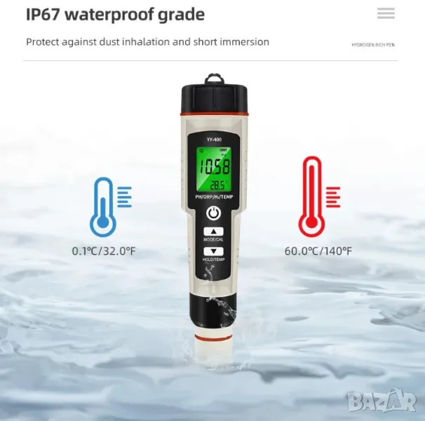 Водоустойчив измервателен уред, проектиран да измерва едновременно H2 и ORP. Също така отчита температурата, която непрекъснато се показва на двустепенния LCD дисплей.