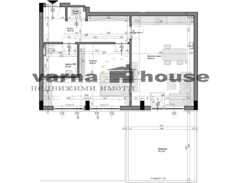 Апартаментът се състои от просторна дневна-почти 26 кв.м., спалня-18.9 кв.м., както и антре-10.8 кв.м., килер и баня с тоалетна. Към жилището има и веранда, която предлага допълнително удобство.