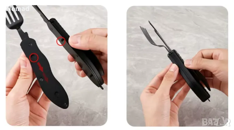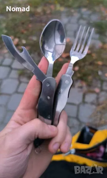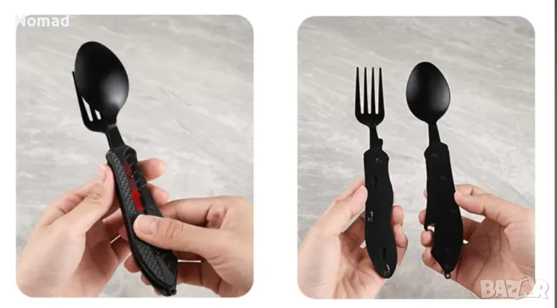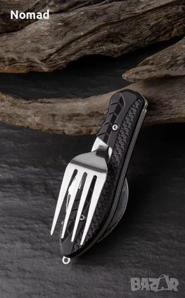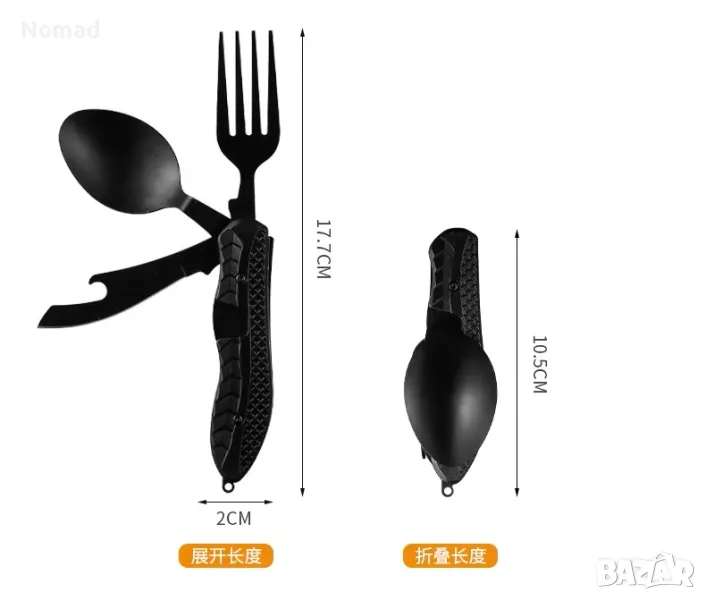 - 4 в 1 – Лъжица, вилица, нож и отварачка за бутилки в един сгъваем комплект.