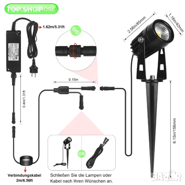Градинска лампа с дълга връзка: Подобрената градинска лампа има 11 x 2,15 m дълъг свързващ кабел и всяка лампа има 2 m дълъг свързващ кабел.