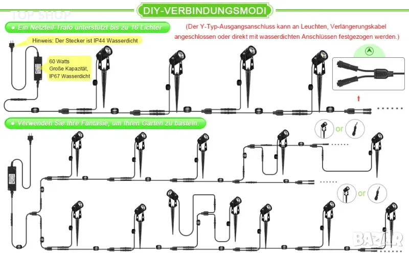 LED градинска лампа с Y-модел кабел: подобрената градинска лампа има свързващ кабел с дължина 11 x 2,15 m. Нов дизайн, има 3 интерфейса на всеки свързващ кабел, 1-2 изхода. В зависимост от вашите нужди можете да свържете свободно осветление или кабел. По-подробни режими на свързване могат да бъдат намерени на Фигура 5. (Бележки: Още удължителни кабели могат да бъдат намерени в нашия ASIN B08FFH5V3M).