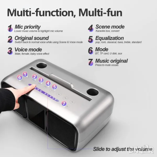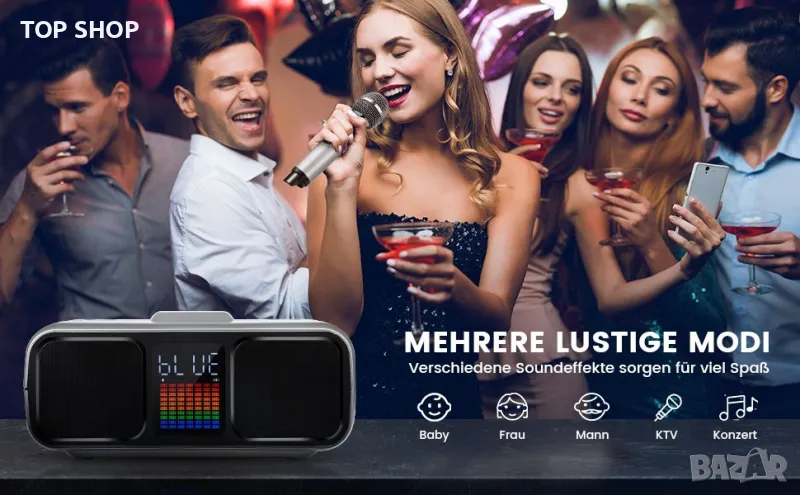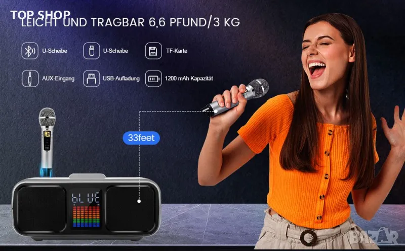 Вградено Bluetooth 5.0 караоке, работен радиус до 33 фута. Лесно свързване към Bluetooth, AUX, TF/USB вход. Можете да записвате поточно аудио чрез микрофона, поставен в USB/TF картата. В допълнение, USB портът може да активира функцията power bank за зареждане на вашия смартфон/таблет.