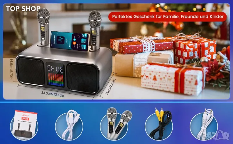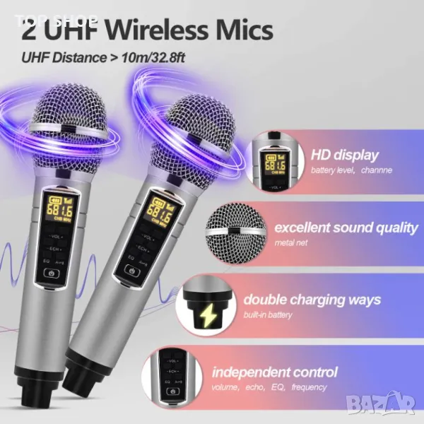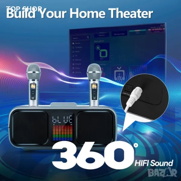 Аудиосистемата може да бъде свързана към таблет, мобилен телефон или други електронни устройства. Два високоговорителя plug-and-play имат стабилен безжичен сигнал от 32 фута. Можете да се наслаждавате на всеки стил музика и да пеете свободно.