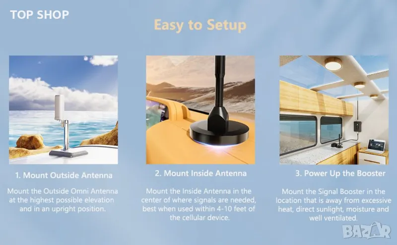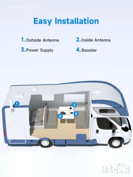 Включва удобно ръководство за осигуряване на бърза, лесна и безпроблемна настройка без инструменти във всеки тип RV, кемпер или ремарке. Просто поставете външната omni-антена на покрива на вашия RV, поставете вътрешната антена в центъра, прекарайте кабелите и включете.