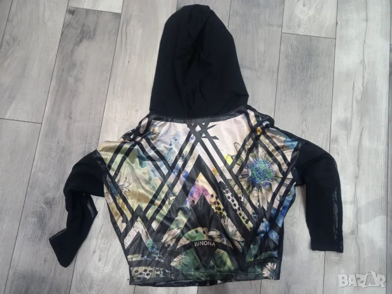 Якето е плътно и памучно. Сатенени апликации и еластична дантела отвътре. Метално лого на марката на качулката и циповете.