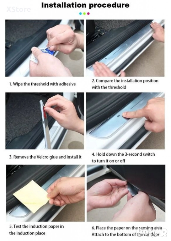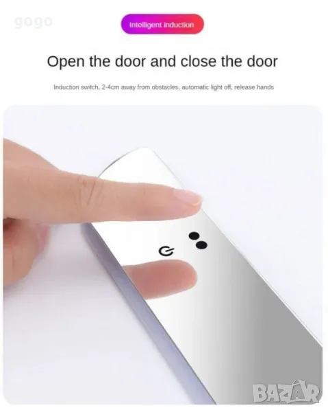 Размери на лентата: 54cm X 4.3cm;Захранване: USB зарядно, 1 час зареждане, 2-3 месеца употреба;Цвят: Бяло, червено, синьо, зелено, циан, жълто, лилаво, ледено синьо;Водоустойчив рейтинг: IP67 (за защита от вода и прах);Сензор: Инфрачервен сензор за откриване на движение, активиращ светлината при отваряне на вратата;Цвят на светлината: RGB многоцветни светлини с възможност за промяна на цвета;Инсталация: Лесна инсталация без окабеляване;Уведомление: Моля, заредете продукта преди употреба, тъй като може да абсорбира електричество при транспортиране.