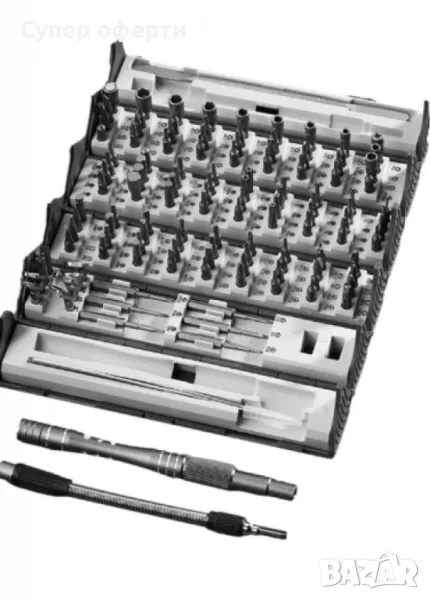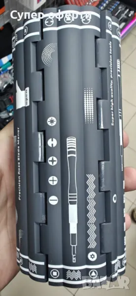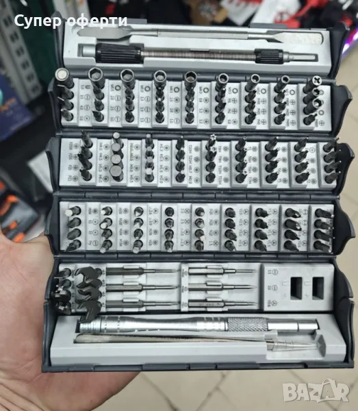 Комплектът прецизни отвертки 128 в 1 е многофункционален и удобен набор, предназначен за работа с малки винтове, които се използват в различни устройства като мобилни телефони, лаптопи, електронни прибори и други. Той включва 128 части, сред които различни видове отвертки, пинсети, инструменти за отваряне и други аксесоари, които могат да се използват за ремонти и монтаж на прецизни електронни устройства.