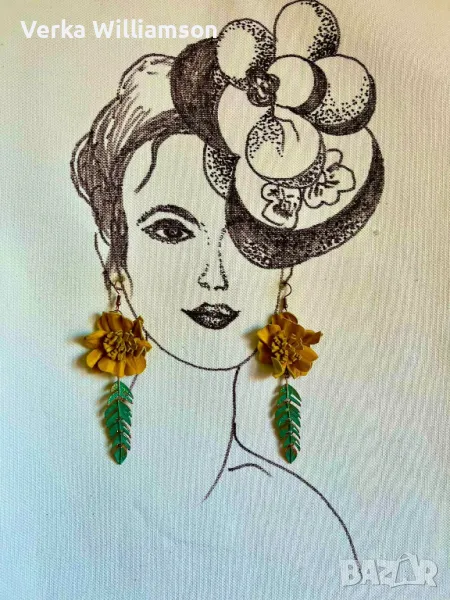 зелено. Метални кукички в тъмно медено. Дължина: 10,5 см. Кожено цвете с
