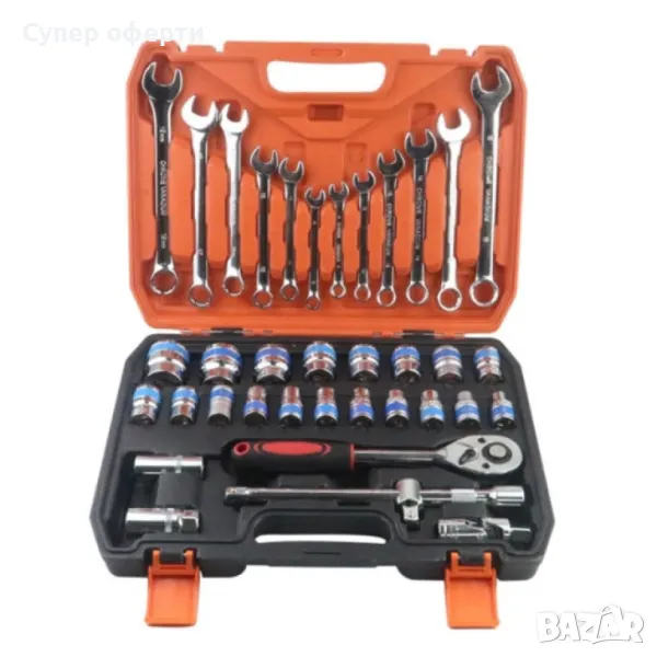 Комплектът тръбни ключове и ключове с фиксиран пръстен съдържа 37 части, изработени от хром-ванадиева стомана, което гарантира издръжливост и дълготрайност. Включва 19 глави, като осигурява разнообразие от размери, подходящи за различни приложения. Сред характеристиките са: