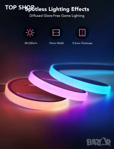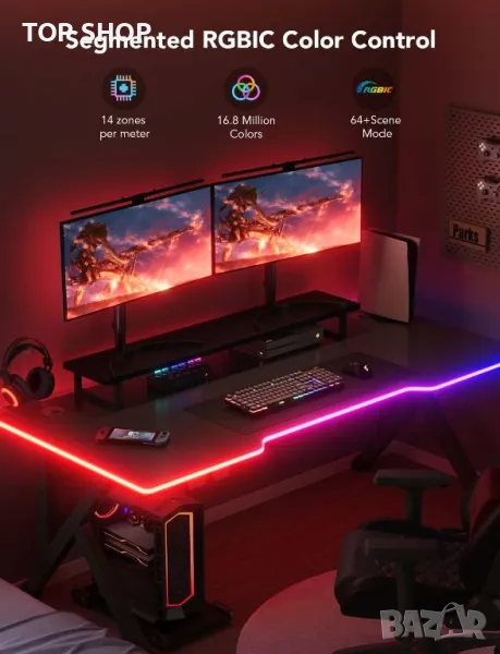 Сегментирано RGBIC осветление: Тези геймърски светлини Govee съдържат 42 контролируеми сегмента за адаптивни RGBIC светлинни ефекти и показват множество цветове. 84 LED перли/m с по-плътни RGBIC светлинни перли създават по-ярка и естествена светлина.