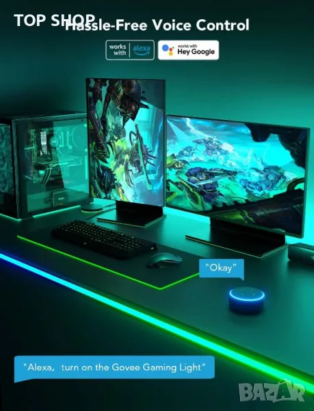 Интелигентно активиране: Управлявайте вашите геймърски LED ленти за бюра с прости гласови команди чрез Alexa и Google Assistant. Изберете от 16 милиона цвята „Направи си сам“, 64+ сценични режима, 11 музикални режима и още с едно докосване на приложението Govee Home.