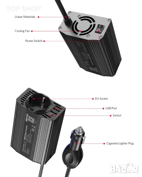 Основни неща за пътуване Инверторът от 300 W може да преобразува изход от 12 V DC в 230 V AC, който се използва главно за работа с електрическо бордово оборудване, мобилни електронни продукти и външни електронни устройства и др.