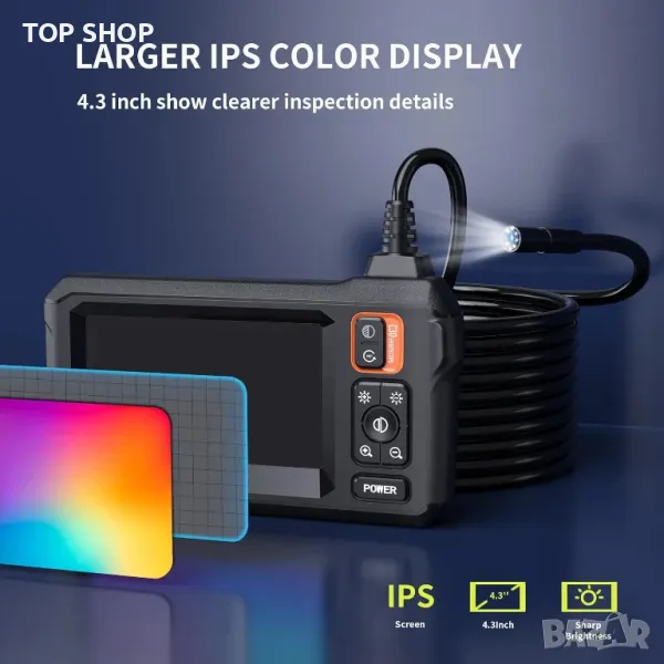 ендоскопска камера с 4,3-инчов цветен LCD екран, който ви позволява да преглеждате изображения с висока разделителна способност в реално време. Лесен за работа, можете да го използвате веднага след включване. Няма нужда да използвате вашия смартфон, за да се свържете с WIFI и няма нужда да изтегляте какъвто и да е драйвер. Така че не е нужно да се притеснявате, че ще изцапате скъпия си телефон и на работа. Забележка: Ендоскопът не може да прави снимки и видеоклипове
