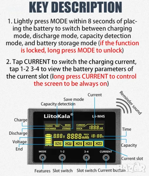 Може едновремено да зарежда, разрежда, тества и съхранява Ni-Cd, Ni-MH и Li-Ion батерии.