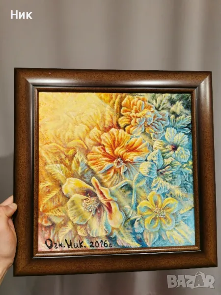 Картина с маслени бои цветя, слънчеви лъчи, макове, нарциси, тагетис, хибискус, аквилегия → Обява 49066546