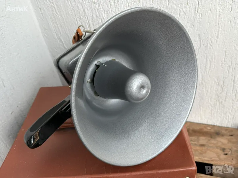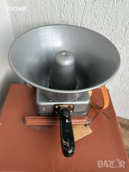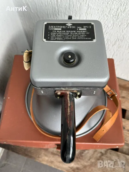 Нов съветски мегафон Электромегафон ЭМ-2М произвеждан от началото на 70-те години. Не използван, в оригиналната си кутия с паспорт и инструкция. Работи с 6 броя батерии 3R12 - 4.5V. Всички гумени елементи са третирани с талк за да бъдат съхранени в годините и са в отлично (еластично) състояние. В комплекто има и резервен микрофон.