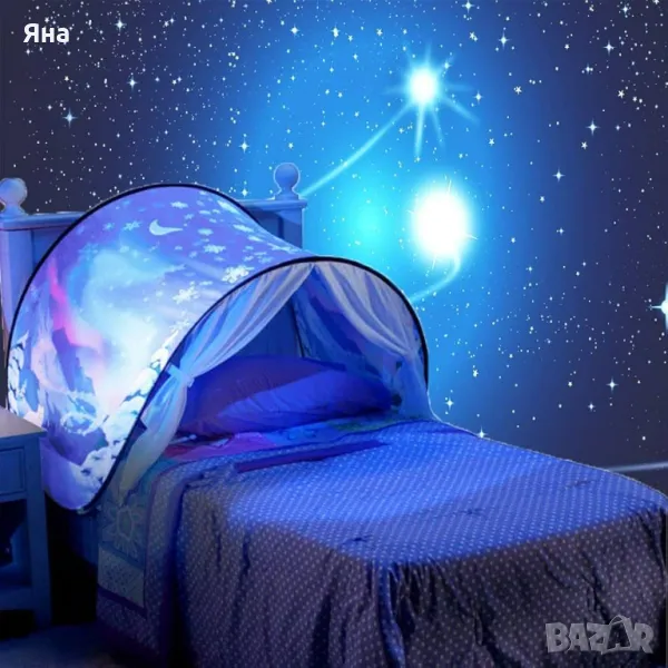 - Превърнете леглото на Вашето дете в един магически свят обсипан със звезди и снежинки. Палатката обещава сладки и спокойни сънища. Създава добре настроение. А и към нея има удобна чанта за съхранение, така че без проблем ще може да я вземате навсякъде с Вас.