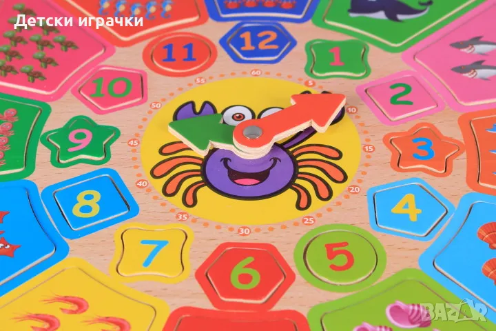 Този забавен часовник ще помогне на детето да опознае цифрите и часовете, да се запознае с геометричните форми и да се научи да брои.