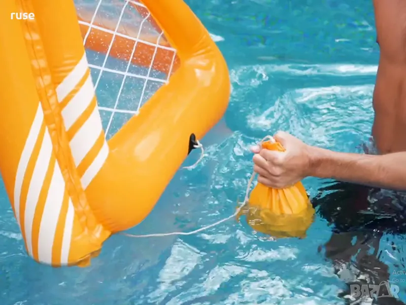 - комплектът включва: надуваема врата, торби за тежести (използват се като котви за фиксиране във водата) и надуваема топка