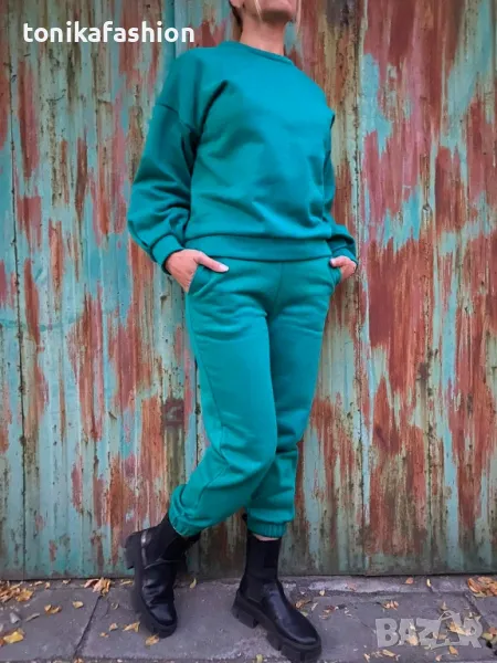 Ватиран ежедневен комплект в тюркоазен цвят. Обемна блуза с паднало рамо и чупки на ръкава към маншета. Долнище с джобове и ластик на крачолите. Размер М.