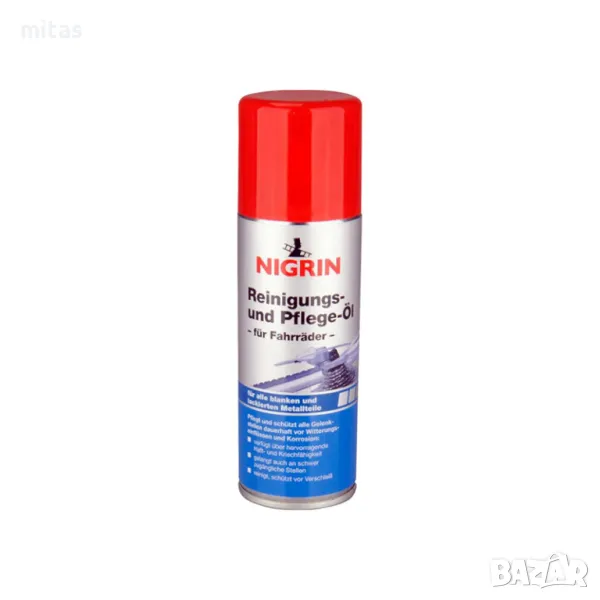 Nigrin Спрей за почистване и поддръжка 200 мл (Nigrin Reinigungs - und Pflegeöl) на всички движещи се метални части и компоненти на велосипеда, които често са трудно достъпни.