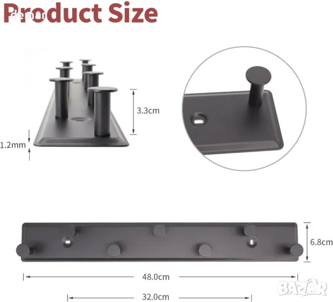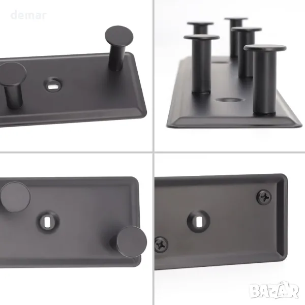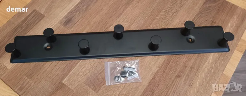 Черна метална стенна закачалка за портманта със седем здрави куки, всяка на разстояние 7 см една от друга, с дължина 48 см. Проектиран за тежка употреба с товароносимост 15-20 кг. Включва целия необходим монтажен хардуер за лесен монтаж. Универсалното матово черно покритие подхожда на врати, шкафове, бани, спални, коридори и кухни. Идеален за окачване на дрехи, кърпи, чанти, шапки, чадъри, кухненски прибори и ключове.