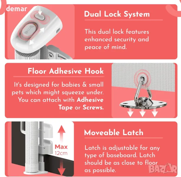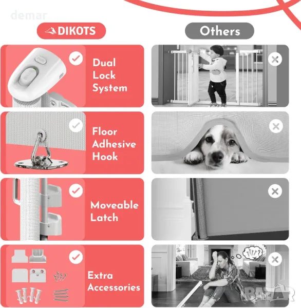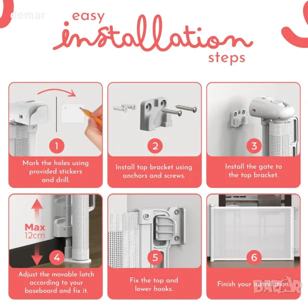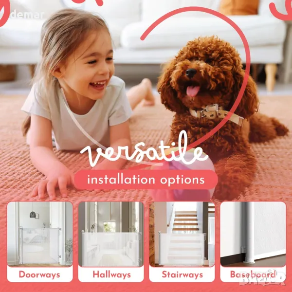 Прибираща се предпазна врата с двоен заключващ механизъм за допълнителна сигурност, предотвратяваща случайно отваряне. Лесен монтаж с допълнителни монтажни елементи за използване на две места, включително подробно ръководство. Долните залепващи куки осигуряват допълнителна стабилност, като гарантират, че нито един домашен любимец или бебе не могат да се плъзнат отдолу. Разтегателен до 140 см ширина и 86 см височина, с автоматичен дизайн на навиване за удобство при спестяване на място. Изработен от издръжливи, висококачествени материали, предлагащи дълготрайна защита за бебета и домашни любимци.