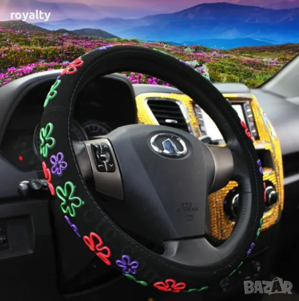 калъф за волан с черно кадифе и апликации на цветя е перфектен избор за всеки автомобил, който се нуждае от стилен и удобен аксесоар. Този продукт съчетава в себе си елегантен дизайн и функционалност, като осигурява комфорт и сигурност по време на шофиране. Възползвайте се от качеството и красотата на този уникален калъф, който ще придаде нов живот на интериора на вашия автомобил.