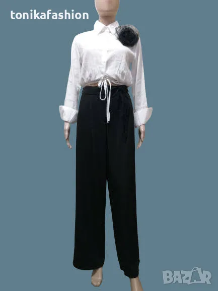 Черен панталон с прав широк крачол,висока талия с ластик на гърба,малки чупки на преднатачаст, кантове, джобове в страничните шевове. Състав полиестер с вискоза и еластан. Размер S - става и за М, размер М - става и за L.
